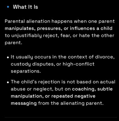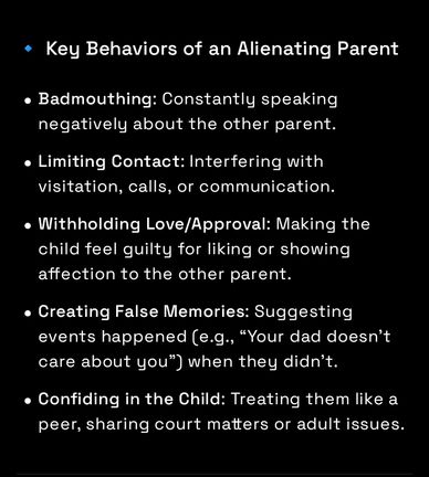 🙎An alienating parent is someone who deliberately undermines a child’s relationship with the other parent. Their behaviors go beyond typical parental disagreements and often manipulate the child’s emotions and perceptions, sometimes creating a network of supporters who reinforce the alienation.